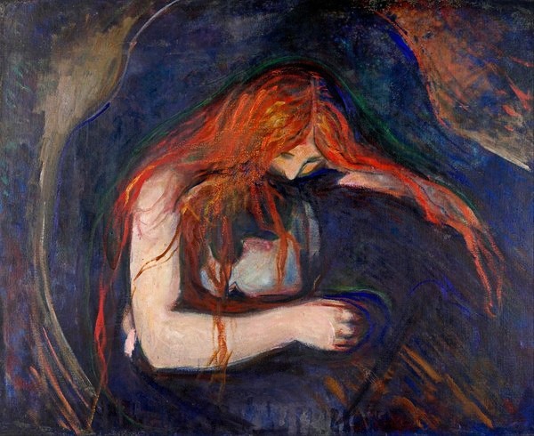 На цій моторошній картині жінка, здається, пронизує чоловічу шию своїми іклами. Мунк спочатку дав своїй роботі іншу назву та стверджував, що жінка не кусає, а цілує чоловіка.